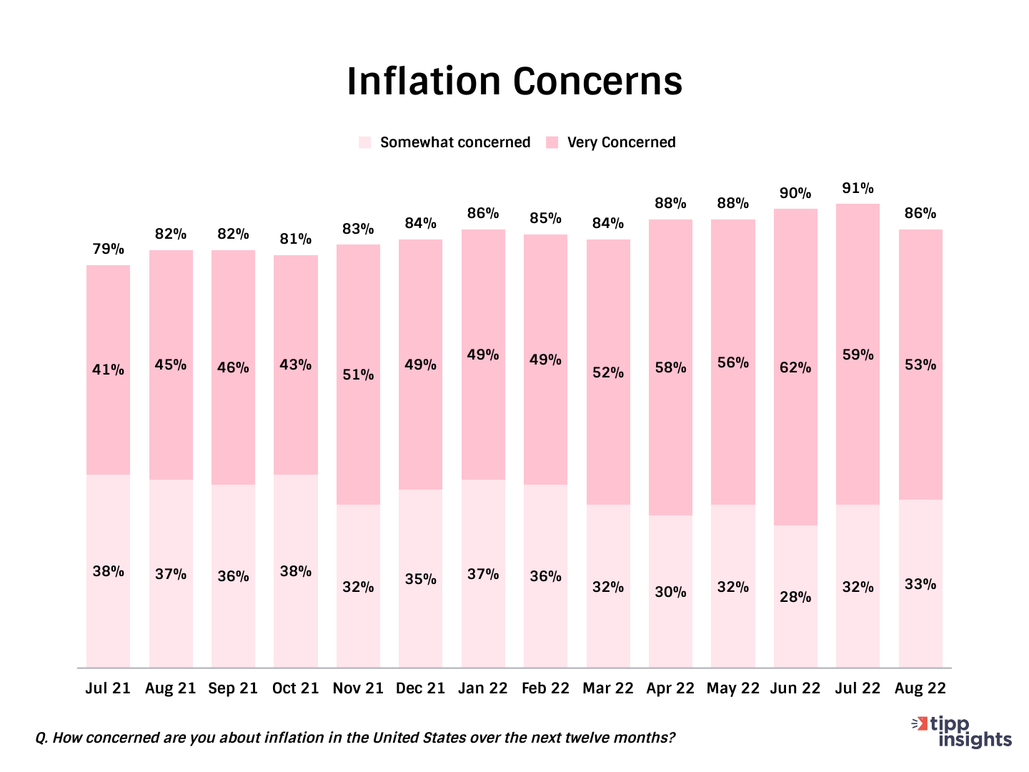 The latest Investor’s Business Daily/TIPP Poll completed last week shows that nearly nine in ten (86%) of survey respondents are worried about inflation. Over the past 12 months, inflation concerns have stayed above 80%. The share of “very concerned” has been around 50% consistently.